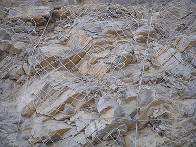 作用原理上类似于喷锚和土钉墙等面层护坡体系,但因其柔性特征能使系统将局部集中荷载向四周均材质:钢丝绳网、普通钢丝格栅(常称铁丝格栅)和TECCO高强度钢丝格栅 匀传递以充分发挥整个系统的防护能力,即局部受载,整体作用,从而使系统能承受较大的荷载并降低单根锚杆的锚固力要求 。